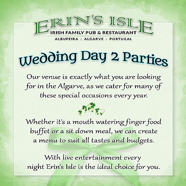 The Erin's Isle venue is exactly what you're looking for in the Algarve as we cater many of these events throughout the year in our restaurant or bar for private parties up to 120 guests. Whether it be a finger buffet or a sit down meal, we will create a menu to suit all tastes and budgets.
